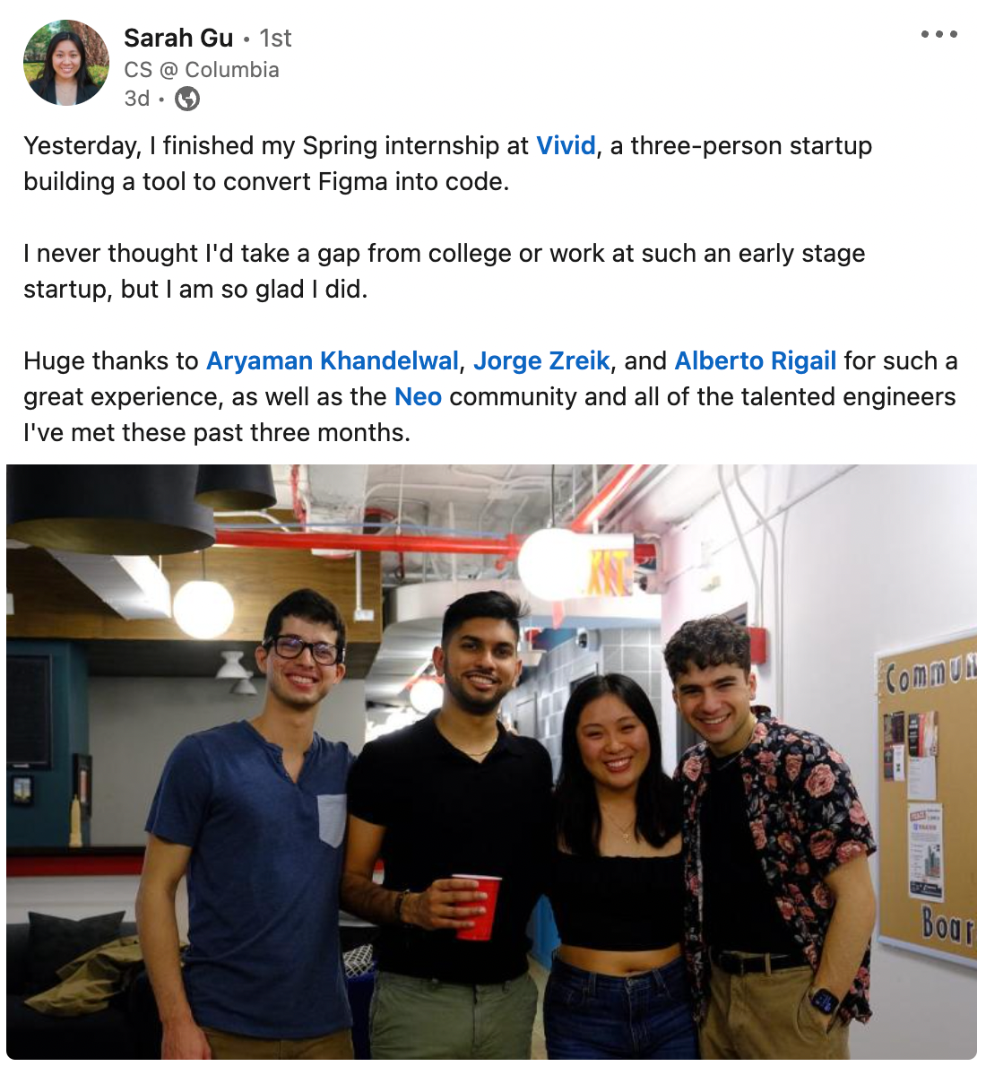 Sarah (Columbia CS Undergraduate) reflected on her valuable experience interning at Vivid (Neo Accelerator ‘22) during a pivotal point at the company.