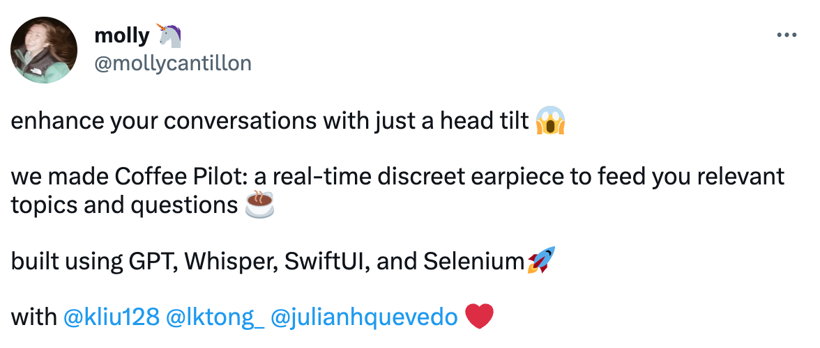 Molly (Stanford CS Undergraduate) worked on Coffee Pilot, a discreet earpiece meant to enhance conversation. Watch the magic happen here!
