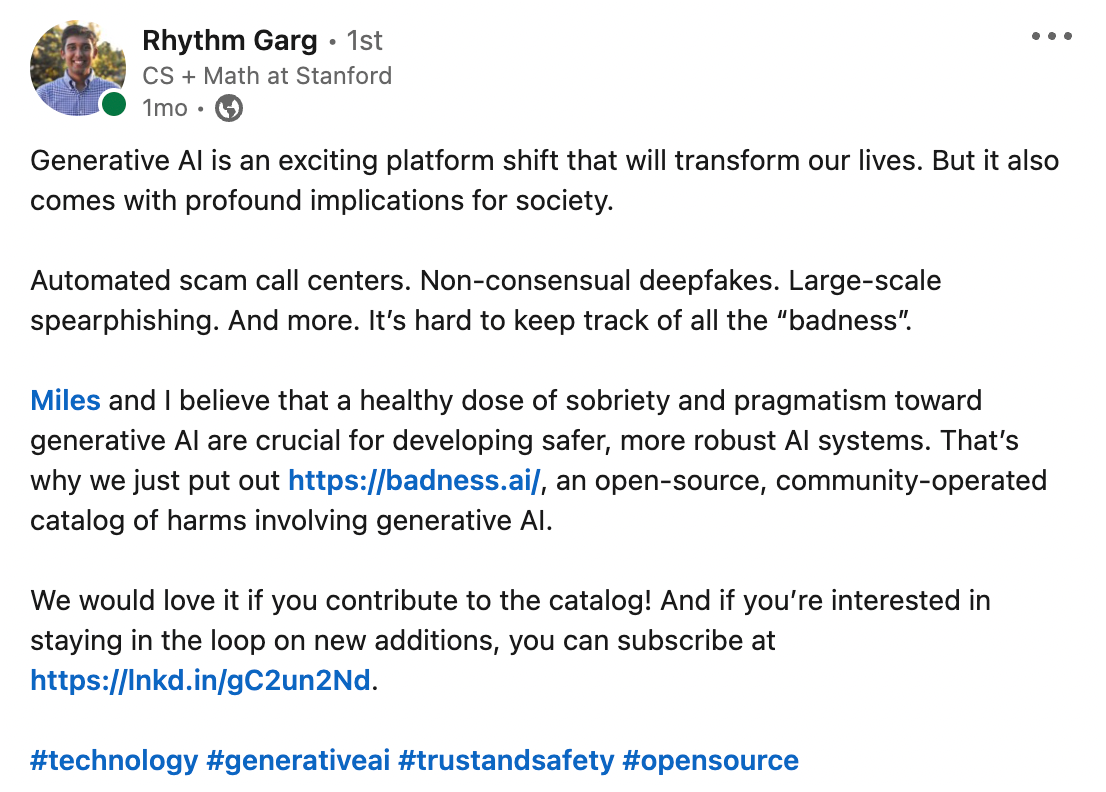 Rhythm & Miles (Stanford CS Undergraduates) created an open catalog of AI badness that you can contribute to.