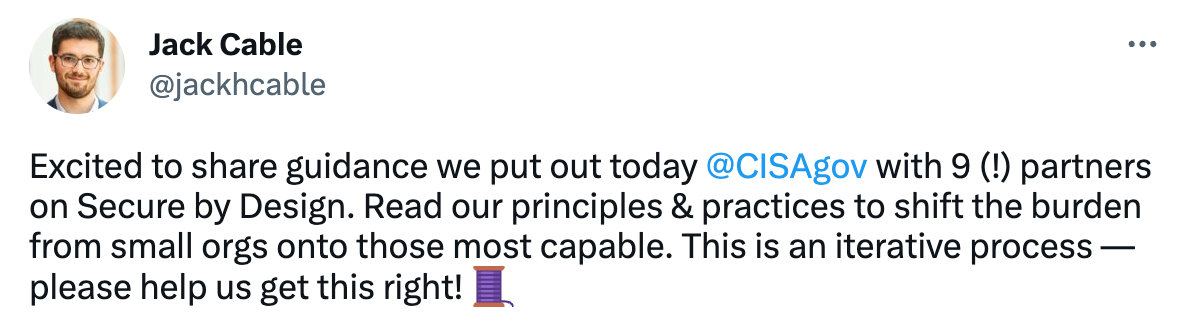 Jack (CISA Senior Technical Advisor) shared new guidance on shifting the burden of cybersecurity to larger, more capable organizations.